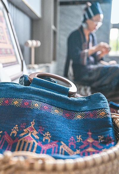 海南省東方市東河鎮(zhèn)黎族傳統(tǒng)紡染織繡技藝省級傳承人符永英用黎錦制作的手袋。