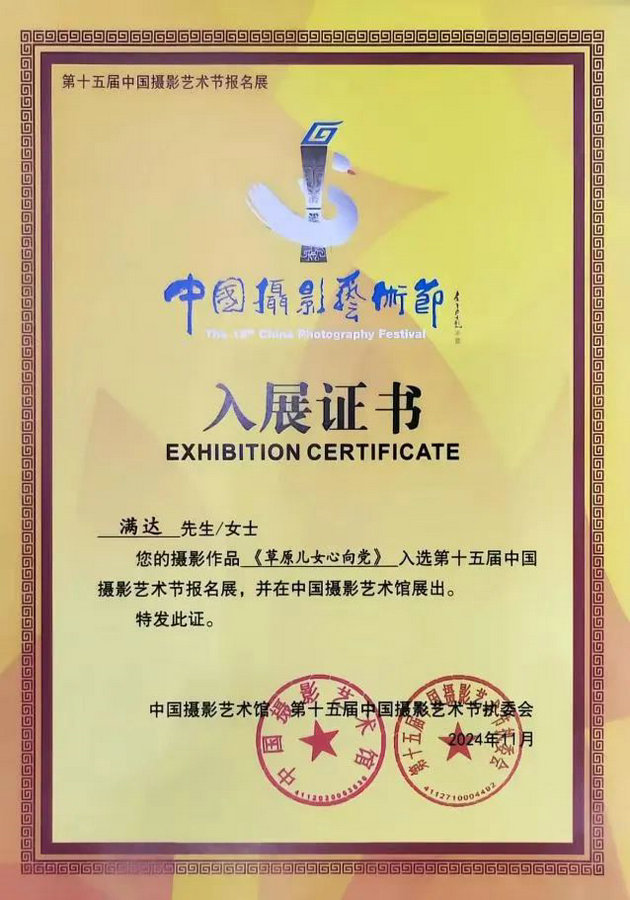 近日,內(nèi)蒙古畫報社記者滿達攝影作品《草原兒女心向黨》入選第十五屆中國攝影藝術(shù)節(jié)報名展。