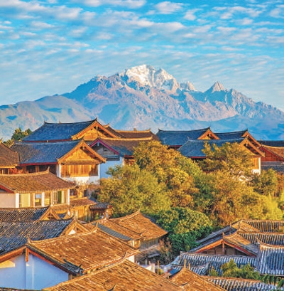 麗江古城與玉龍雪山交相輝映。