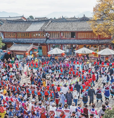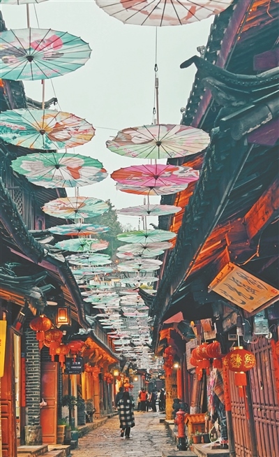 麗江古城涵蓋了作為茶馬古道重鎮(zhèn)的大研古城、從農(nóng)耕文明向商業(yè)文明過渡的“活標(biāo)本”束河古鎮(zhèn)、有著原生態(tài)納西村落的白沙古鎮(zhèn),融匯了漢族、白族、彝族、藏族、納西族等多民族文化特色。作為一座沒有城墻的古城,麗江古城以包容與開放的姿態(tài),歷經(jīng)文化的交融與碰撞,源源不斷地孕育出充滿魅力的文化新形態(tài)。