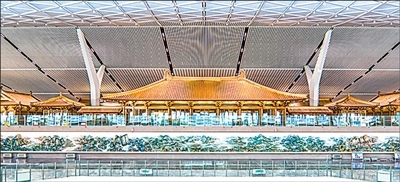 西部機場博物館以仿唐建筑群形式落地航站樓核心區(qū)。廡殿頂、斗拱飛檐與玻璃幕墻的“跨界”,形成古今對話的視覺符號。展廳內(nèi),也不乏設(shè)計的巧思?;娟惲姓褂[所在場館命名為“四方館”,取自隋唐外交機構(gòu)名稱;專題陳列展覽所在場館命名為“珍寶館”,輪展陜西各大博物館(院)的“鎮(zhèn)館之寶”;文創(chuàng)區(qū)包含唐代仕女形象IP、漢代銅鋪首冰箱貼等,將文物轉(zhuǎn)化為“能帶走”的文化記憶。