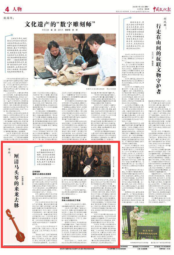2025年7月14日《中國文化報》第4版刊發(fā)了題為《布林:厘清馬頭琴的來龍去脈》的文章,報道了做為非物質(zhì)文化遺產(chǎn)項目蒙古族馬頭琴音樂代表性傳承人的布林立足民間傳說的同時又埋頭于各種典籍。他說作為代表性傳承人,有必要更有責任將馬頭琴的來龍去脈說清楚,對歷史、對未來都有個交代。