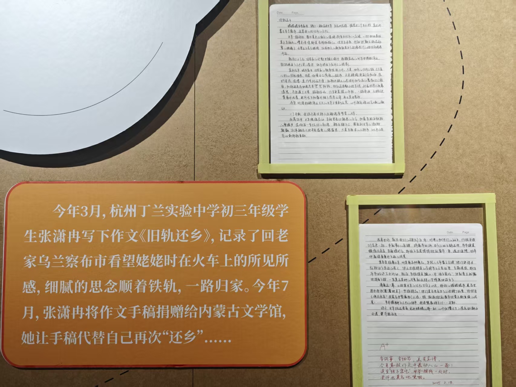 值得一提的是,憑借作文《舊軌還鄉(xiāng)》引起網(wǎng)友廣泛關(guān)注和共鳴的內(nèi)蒙古籍女孩張瀟冉,今年7月將手稿捐贈(zèng)給了內(nèi)蒙古文學(xué)館,本次展覽對(duì)《舊軌還鄉(xiāng)》手稿進(jìn)行展出。展覽還展出了生于2007年的少女詩(shī)人姜二嫚的詩(shī)作,年少成名的姜二嫚用7歲時(shí)所作的《光》向全國(guó)小詩(shī)人們送上問(wèn)候。