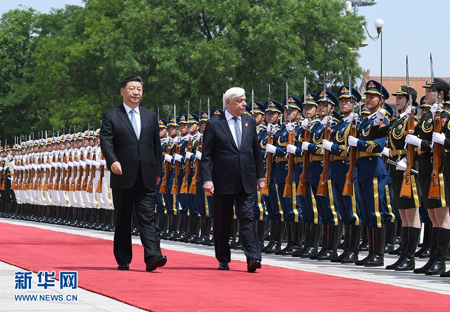 5月14日,國家主席習(xí)近平在北京人民大會堂同希臘總統(tǒng)帕夫洛普洛斯舉行會談。這是會談前,習(xí)近平在人民大會堂東門外廣場為帕夫洛普洛斯舉行歡迎儀式。 新華社記者 張領(lǐng) 攝