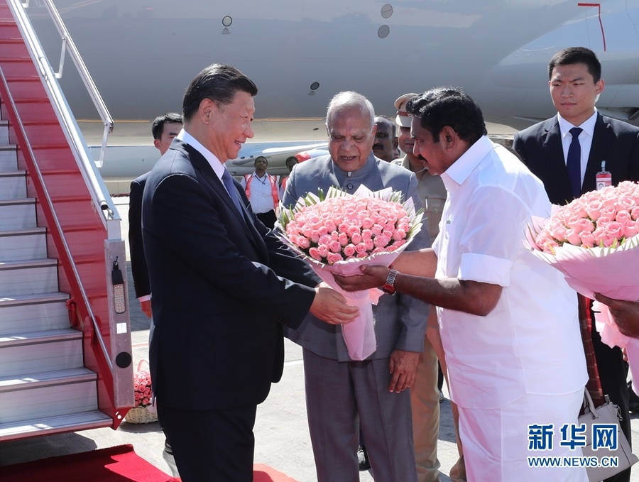 10月11日,國家主席習(xí)近平乘專機(jī)抵達(dá)金奈,應(yīng)印度共和國總理莫迪邀請(qǐng),出席中印領(lǐng)導(dǎo)人第二次非正式會(huì)晤。印度泰米爾納德邦邦長普羅希特、首席部長帕拉尼斯瓦米等在舷梯旁迎接,向習(xí)近平敬獻(xiàn)鮮花。