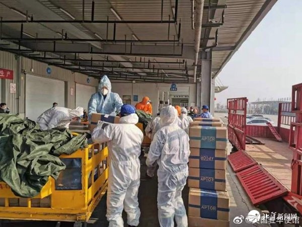 英國政府援助醫(yī)療物資送抵中國。圖片來自英國駐華大使館微博賬號(hào)。