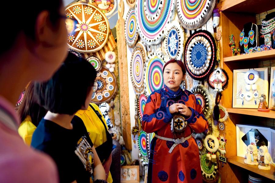 借助自己的鄂倫春族身份,白鵬英成立手工藝坊,組織婦女制作鄂倫春族手工藝品,然后利用網(wǎng)上平臺(tái)銷售到全國(guó)各地,每個(gè)婦女每年平均可增收1000元。