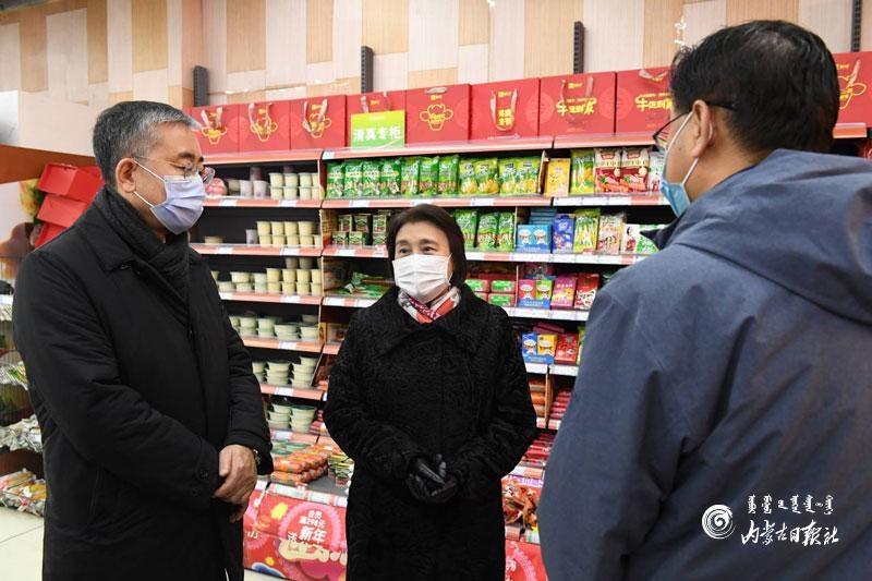 1月17日上午,自治區(qū)黨委副書記、自治區(qū)主席布小林在呼和浩特市維多利喜悅匯超市檢查生活物資供應(yīng)、食品安全和疫情防控情況。內(nèi)蒙古日報記者 韓卿立 攝