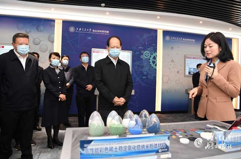4月22日,自治區(qū)黨委書記、人大常委會(huì)主任石泰峰,與參加自治區(qū)推動(dòng)高質(zhì)量發(fā)展重大項(xiàng)目建設(shè)動(dòng)員大會(huì)的代表一起觀摩上海交通大學(xué)包頭材料研究院及產(chǎn)業(yè)園。內(nèi)蒙古日?qǐng)?bào)社融媒體記者 袁永紅 攝