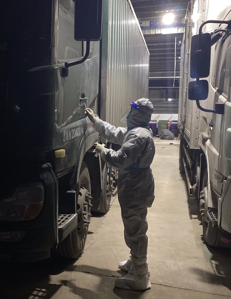 11月4日凌晨,工作人員對(duì)貨車把手采樣。(通遼市疾控中心供圖)