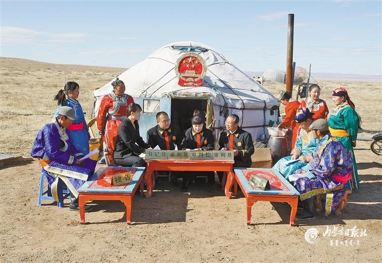 錫林浩特市人民法院組建的“牧區(qū)巡回法庭”開(kāi)到了牧民家門(mén)口,被當(dāng)?shù)厝罕娪H切地稱(chēng)為“馬背法庭”。內(nèi)蒙古日?qǐng)?bào)社融媒體記者 馬建荃 攝
