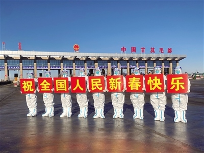 1月31日,民警在甘其毛都口岸貨運(yùn)通道祝全國(guó)人民新春快樂。春節(jié)期間,內(nèi)蒙古甘其毛都出入境邊防檢查站民警堅(jiān)守一線,為出入境車輛提供優(yōu)質(zhì)高效的通關(guān)服務(wù),守護(hù)萬家燈火。(記者 孟和朝魯 通訊員 宋緒明 攝)