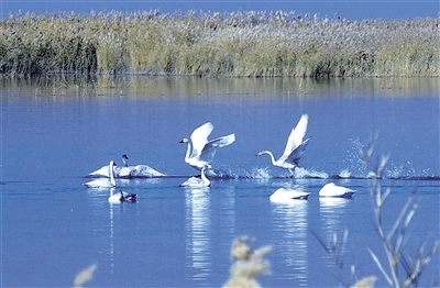 在烏梁素海棲息的天鵝。高曉龍攝