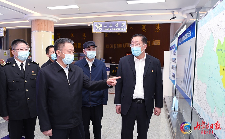 5月16日,自治區(qū)黨委書記孫紹騁來到策克口岸,詳細(xì)了解口岸建設(shè)和疫情防控情況。記者袁永紅攝