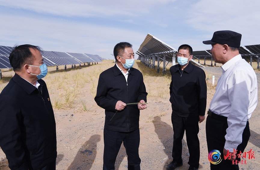 5月17日,自治區(qū)黨委書記孫紹騁考察阿拉善左旗內(nèi)蒙古巴音新能源有限公司新能源基地建設(shè)及光伏治沙情況。記者袁永紅攝