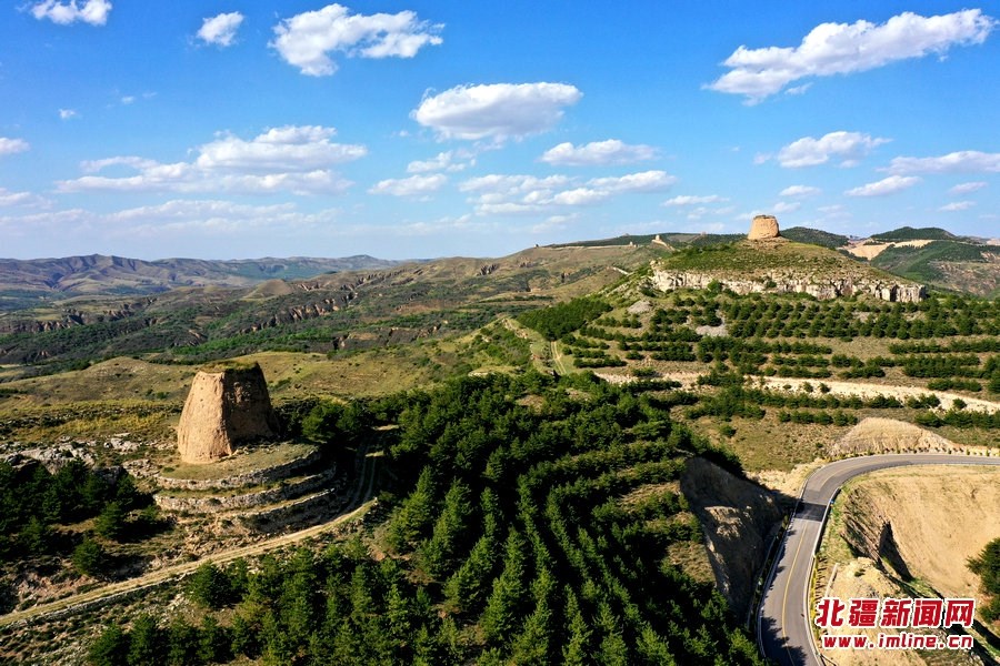 端午時(shí)節(jié),由G209國道岔口至老牛坡的公路正在緊張建設(shè)中。汽車沿著剛剛鋪好軟基的砂石路面行進(jìn),車窗外,高高低低的烽火墩臺(tái)聳立在山巒之上,巍峨雄偉,座座墩臺(tái)直沖云霄,蔚為壯觀。清水河縣明長城國家文化公園的核心區(qū)小元峁段長城(栜木塔長城)即位于此。