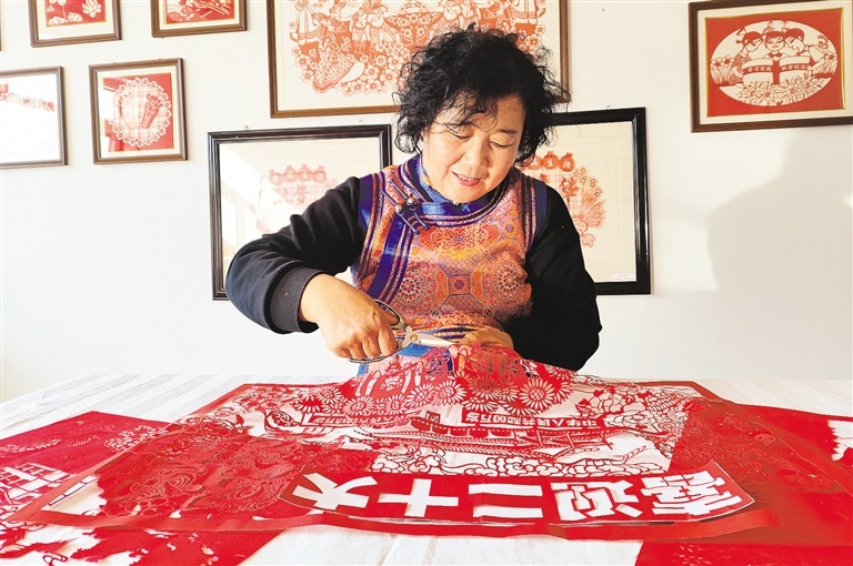 10月15日下午,自治區(qū)非遺剪紙項(xiàng)目傳承人、呼和浩特市土默特左旗畢克齊鎮(zhèn)紅秀剪紙合作社發(fā)起人李還秀在創(chuàng)作慶祝黨的二十大勝利召開系列剪紙作品。連日來,全區(qū)各地群眾通過剪紙、書法等藝術(shù)形式,表達(dá)對盛會的期盼、對祖國的祝福。記者 鄭學(xué)良 實(shí)習(xí)生 郭亞麗 攝