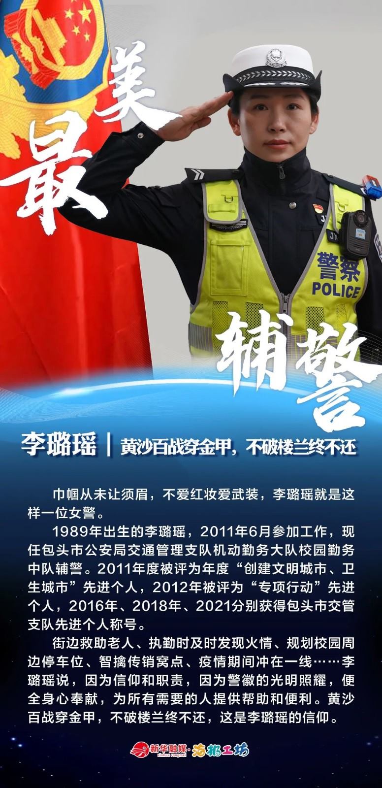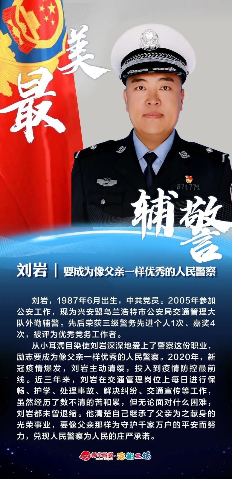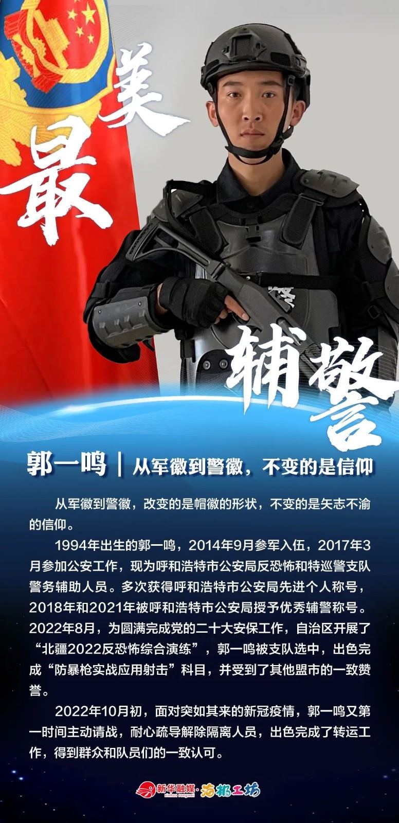 “不同的肩章,同樣的堅(jiān)守……”在“感動(dòng)北疆·最美輔警”獲獎(jiǎng)?wù)咧校?strong>有堅(jiān)守忠誠的安全衛(wèi)士郭一鳴,對(duì)癥下藥的老片兒警康華,服務(wù)群眾的熱心人辛永紅,校園安全的“護(hù)航員”李璐瑤,社區(qū)警務(wù)“信息化管家”鄭威,警務(wù)支撐“小能手”胡建業(yè),110接處警“活地圖”劉順峰,網(wǎng)上巡查“質(zhì)檢員”王昊,基層交通安全“好聲音”劉巖,一線“智慧公安”排頭兵張?zhí)睢?/strong>