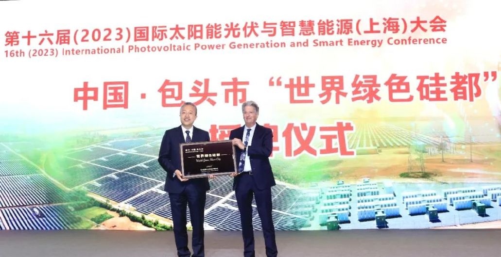 5月23日,第十六屆(2023)國際太陽能光伏與智慧能源(上海)大會召開。大會開幕式上,全球綠色能源理事會授予包頭市“世界綠色硅都”稱號。澳大利亞新南威爾士大學教授、超高效光電學研究中心兼任執(zhí)行研究主任、澳大利亞科學院院士馬丁·格林代表全球綠色能源理事會向包頭市授牌。自治區(qū)黨委常委、市委書記丁繡峰致辭并推介“世界綠色硅都”。市委副書記、市長張銳代表包頭市接牌。