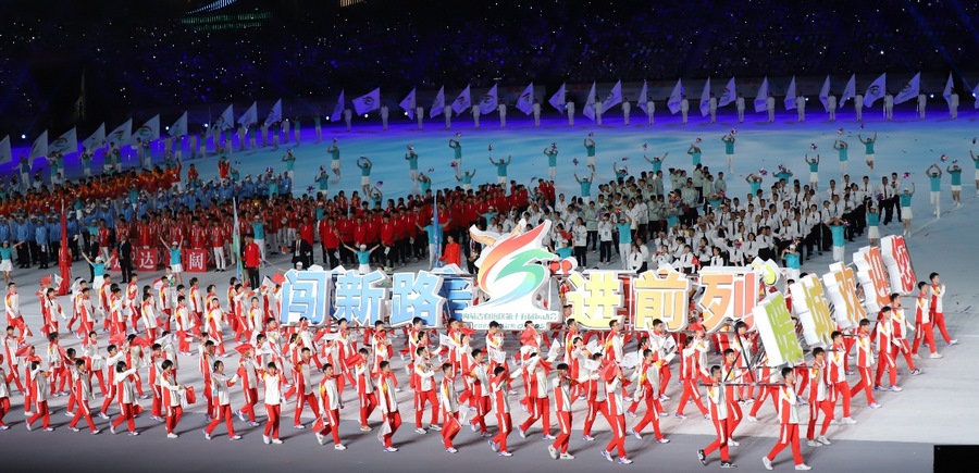 開幕式現(xiàn)場座無虛席,萬眾矚目下儀仗隊(duì)護(hù)送五星紅旗步入會場,國旗莊嚴(yán),腳步鏗鏘,一種豪邁和驕傲激蕩在每個人的心里。