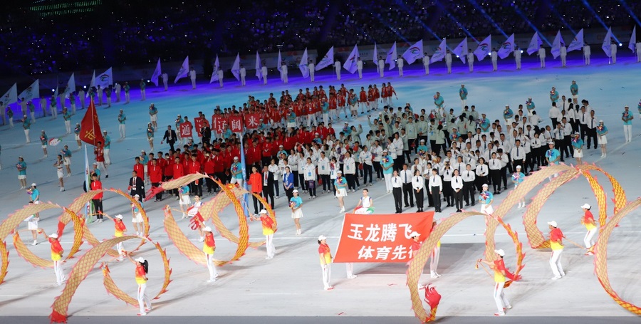 入場儀式結(jié)束后,在雄壯的國歌聲中,鮮艷的五星紅旗冉冉升起,在體育中心上空迎風(fēng)飄揚(yáng)。期盼的眼神,真摯的祝福,蕩漾在每個人的心間。開幕式文體展演隨后正式拉開帷幕。