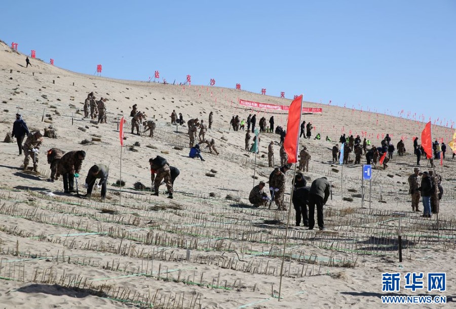 ??參會人員與專業(yè)技術(shù)服務(wù)隊以及社會各界代表,在渾善達克沙地設(shè)置沙障。新華網(wǎng) 石毅攝