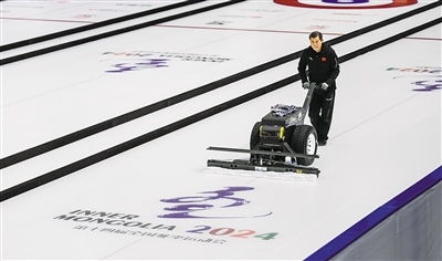 12月7日,走進位于呼倫貝爾市海拉爾區(qū)的內蒙古自治區(qū)冰上運動訓練中心冰球冰壺館,只見制冰師正在一遍又一遍地修整冰面,為即將到來的“十四冬”冰壺項目青年組比賽做準備。