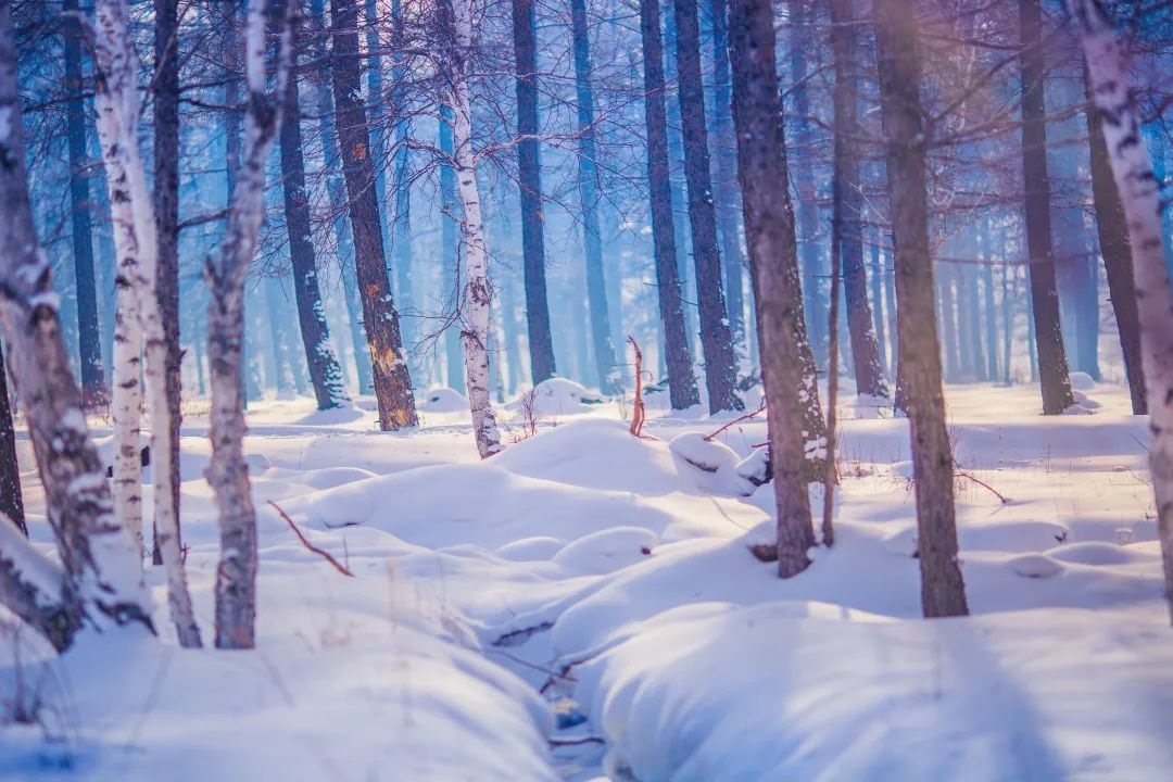 大片白樺樹(shù)筆直挺拔的矗立在白雪覆蓋的天地間,漫步其中留下腳印,陽(yáng)光穿過(guò)林間寧?kù)o安詳,樸樹(shù)的歌聲不禁在腦海里響起。
