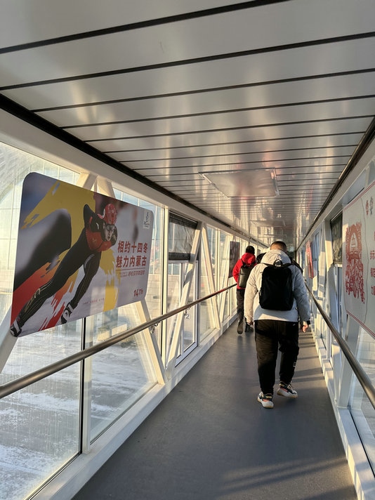 當(dāng)記者一出機(jī)艙,一股寒流瞬間襲來,又瞬間被機(jī)場廊道、候機(jī)區(qū)、旅客出口區(qū)域滿滿的“十四冬”氛圍以及志愿者的迎接暖了心。