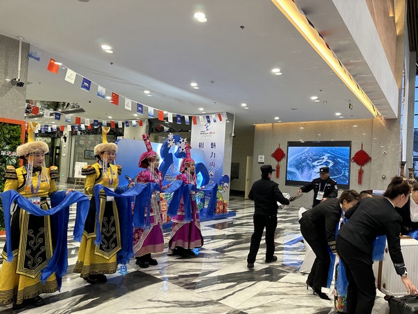 當(dāng)?shù)竭_(dá)負(fù)責(zé)接待“十四冬”媒體記者和技術(shù)官員的呼倫貝爾市鄂溫克賓館時,剛進(jìn)賓館大廳,身著蒙古袍的工作人員手捧哈達(dá)迎接著遠(yuǎn)方的朋友,并為每位來賓獻(xiàn)上哈達(dá)表示誠摯的祝福。一旁還有熱騰騰的奶茶和美味的果條供大家享用。