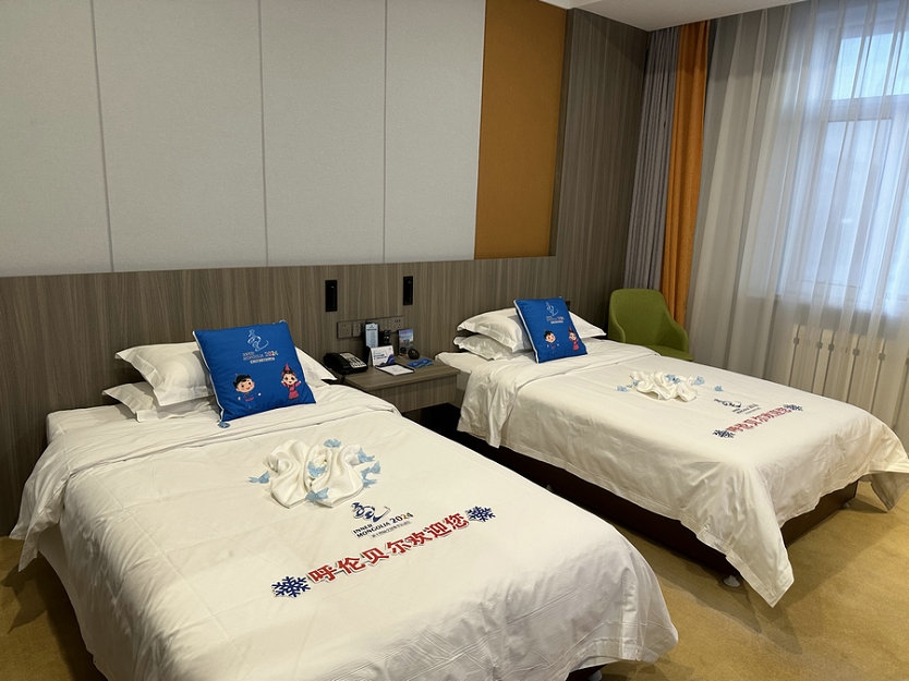 當(dāng)記者走進(jìn)酒店房間時,“十四冬”的吉祥物抱枕擺在床頭,床上用毛巾和花朵擺的雪花造型以及“呼倫貝爾歡迎您”的暖心話語,瞬間趕走一路疲憊。