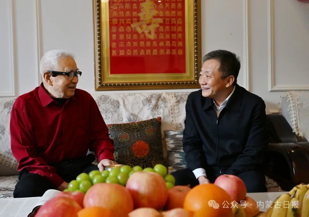 1月21日,自治區(qū)黨委書記孫紹騁來到建國前老黨員、五一大會親歷者烏力吉圖家中,與老人促膝交談,關(guān)切地詢問老同志的身體和生活狀況。草原全媒?內(nèi)蒙古新聞網(wǎng)記者馬建荃攝