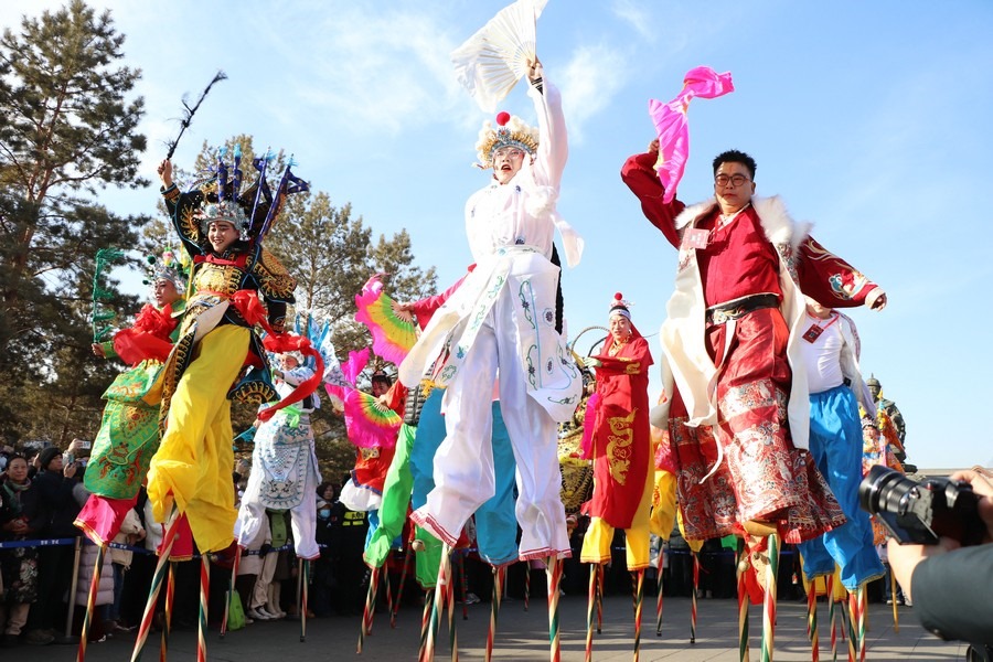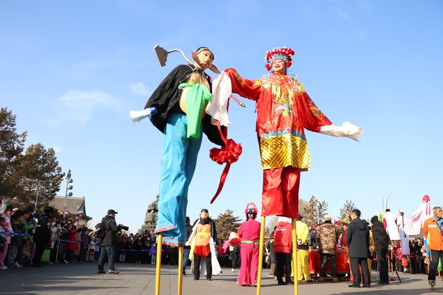 現(xiàn)場人潮涌動(dòng),歡聲笑語此起彼伏。扭秧歌隊(duì)伍身著色彩斑斕的服裝,手持彩扇,隨著歡快的音樂節(jié)奏,邁出輕盈的步伐,每一個(gè)動(dòng)作都充滿了力量感和韻律感。他們的表情歡快,笑容燦爛,將歡樂傳遞給每一位觀眾。與此同時(shí),踩高蹺也吸引了眾多觀眾的目光。演員們踩著高高的木蹺,身著華麗的戲服,扮演著各種角色,自如地行走、跳躍,引得觀眾陣陣喝彩。