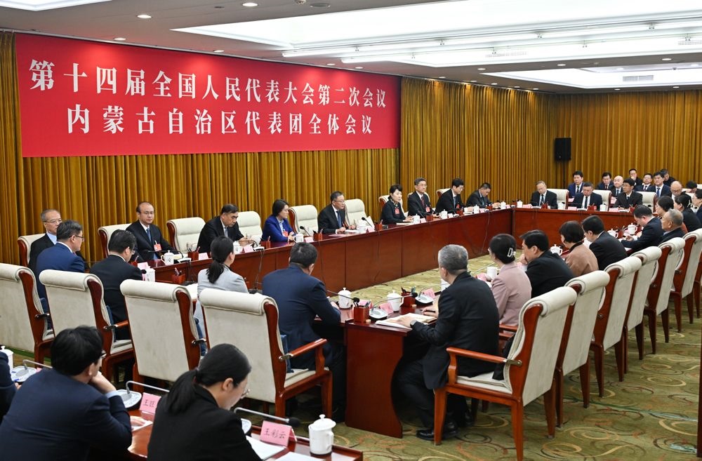 3月3日,出席十四屆全國(guó)人大二次會(huì)議的內(nèi)蒙古代表團(tuán)在駐地召開(kāi)全體會(huì)議。草原全媒記者 馬建荃 攝