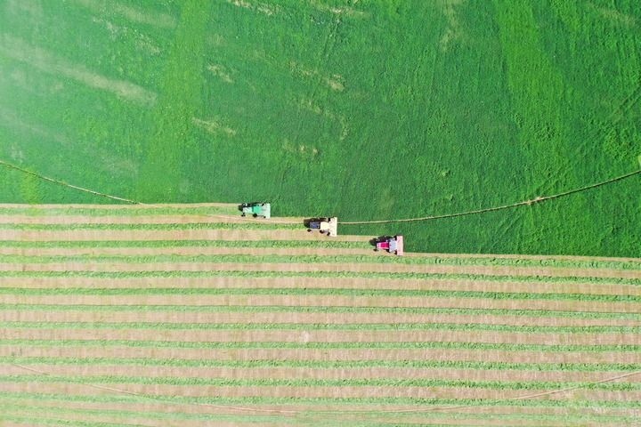 2023年6月4日,在土默特左旗國家現(xiàn)代農(nóng)業(yè)示范區(qū)內(nèi),機(jī)械車輛在收割苜蓿(無人機(jī)照片)。新華社記者劉磊攝