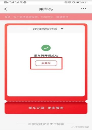 開通成功后,點(diǎn)擊“去乘車”獲取乘車二維碼,在進(jìn)、出閘機(jī)對應(yīng)區(qū)域掃描二維碼即可。