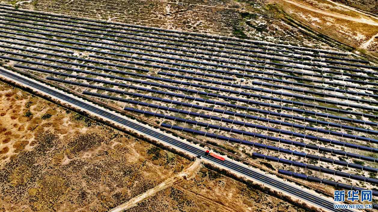 ??6月14日,在地處科爾沁沙地邊緣的翁牛特旗其甘地區(qū)拍攝的光伏發(fā)電場。新華網(wǎng)發(fā)(李富 攝)