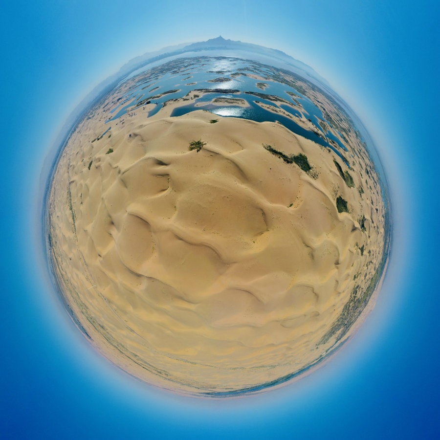 烏海湖與浩瀚的烏蘭布和沙漠相連,形成沙水相連自然景觀,平靜的湖面猶如一面巨大的鏡子,將湛藍的天空和金色的沙漠倒映其中。