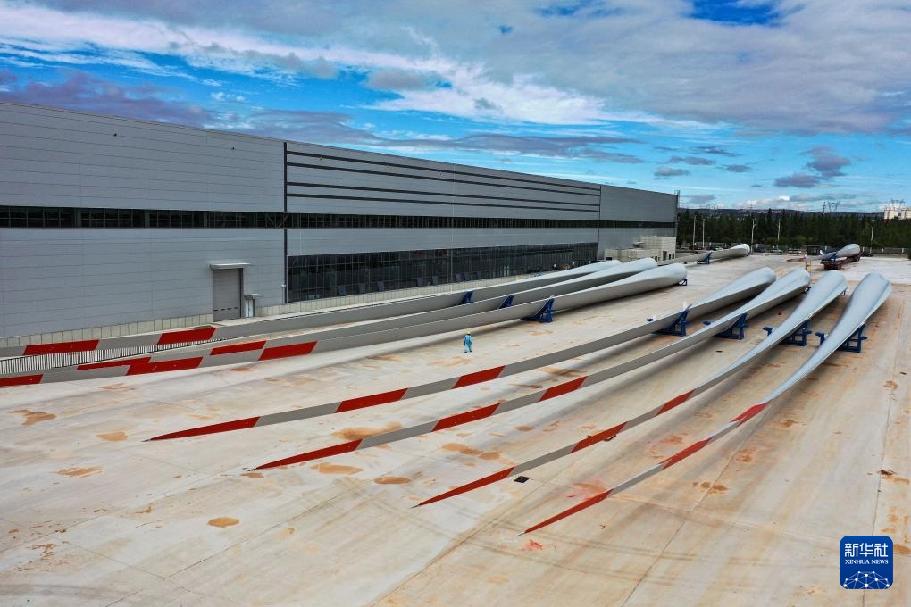 ??這是9月20日拍攝的位于鄂爾多斯市的株洲時代新材料科技股份有限公司蒙西分公司內(nèi)的風(fēng)機(jī)葉片(無人機(jī)照片)。