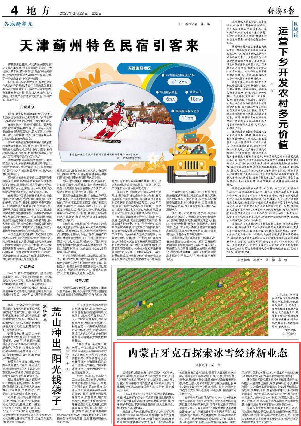 2025年2月23日,《經(jīng)濟日報》第4版刊發(fā)題為《內(nèi)蒙古牙克石探索冰雪經(jīng)濟新業(yè)態(tài)》的 文章,報道了2024年內(nèi)蒙古自治區(qū)牙克石市共接待國內(nèi)外旅游者286.62萬人次,同比增長39.66%;旅游業(yè)總收入35.57億元,同比增長22.66%。