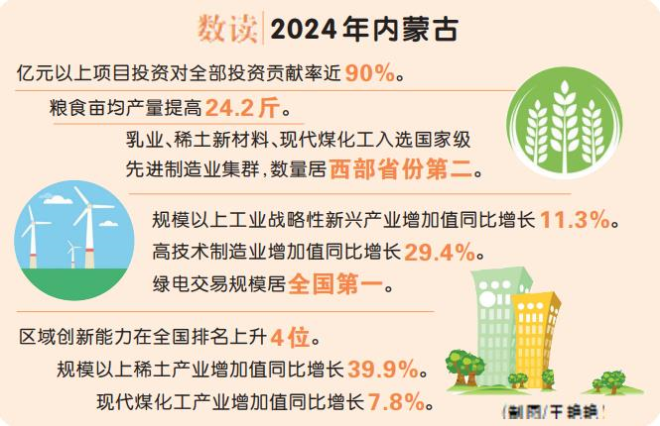 新賽道上,受益于高質(zhì)量重大項(xiàng)目帶動,2024年,自治區(qū)綠電交易規(guī)模居全國第一;“蒙科聚”平臺技術(shù)合同成交額同比增長33.6%,全區(qū)凈增科技型中小企業(yè)853家、高新技術(shù)企業(yè)97家、科技領(lǐng)軍企業(yè)20家,乳業(yè)、稀土、氫、儲等領(lǐng)域取得一批填補(bǔ)行業(yè)空白的技術(shù)突破,我區(qū)區(qū)域創(chuàng)新能力在全國排名上升4位;全區(qū)規(guī)模以上新能源及相關(guān)產(chǎn)業(yè)增加值同比增長20.1%,規(guī)模以上工業(yè)戰(zhàn)略性新興產(chǎn)業(yè)增加值同比增長11.3%,高技術(shù)制造業(yè)增加值同比增長29.4%……推動新興產(chǎn)業(yè)“強(qiáng)筋壯骨”、未來產(chǎn)業(yè)加速培育,內(nèi)蒙古落子如飛!