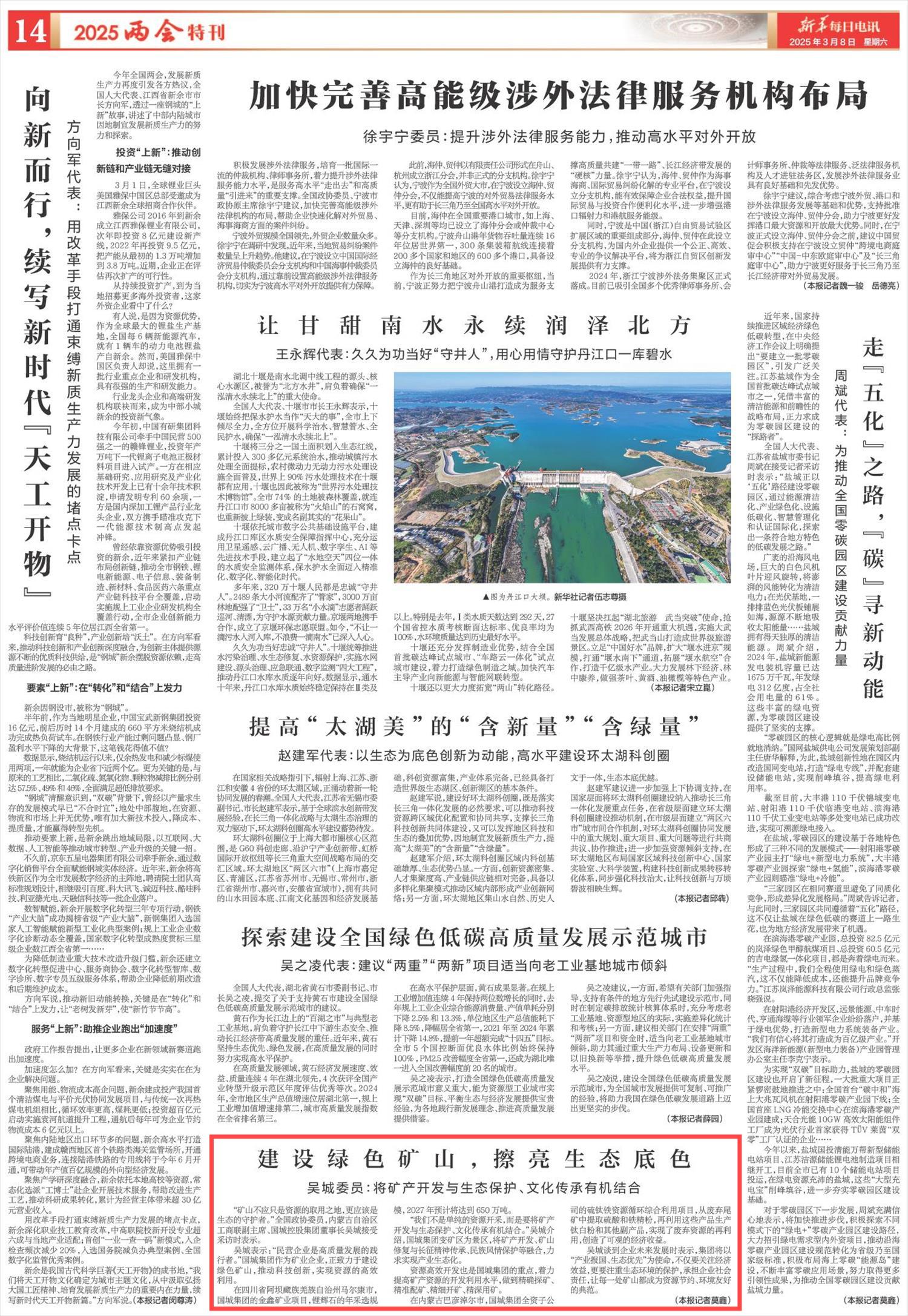 2025年3月8日,《新華每日電訊》第14版刊發(fā)題為《建設(shè)綠色礦山,擦亮生態(tài)底色》的消息,報(bào)道了吳城委員介紹,“我們不是單純的資源開采,而是要將礦產(chǎn)開發(fā)與生態(tài)保護(hù)、文化傳承有機(jī)結(jié)合。”