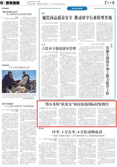 2025年4月7日,《農(nóng)民日報(bào)》第6版刊發(fā)題為《鄂爾多斯“軟黃金”何以驚艷國際時(shí)裝舞臺》的文章,報(bào)道了日前,在上海舉行的一場國際時(shí)裝品牌慶典上,來自內(nèi)蒙古鄂爾多斯市阿爾巴斯山羊絨驚艷亮相,受到國內(nèi)外客商追捧。該羊絨憑借卓越品質(zhì)斬獲慶典"年度最佳羊絨大獎(jiǎng)",成為全球唯一獲此殊榮的產(chǎn)品。