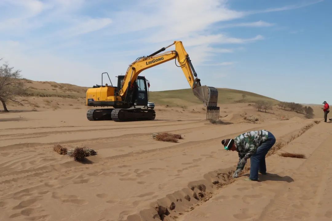 改裝后的挖掘機(jī)在治沙工作中展現(xiàn)出了強(qiáng)大的優(yōu)勢(shì)。據(jù)了解,以往人工種植時(shí),兩個(gè)人一天才能完成一畝地的工作量,五個(gè)人最多也只能處理兩畝半到三畝地。而如今,改裝后的挖掘機(jī)一天的工作量相當(dāng)于五個(gè)人種植十畝地,不僅大大提升了工作效率,還節(jié)約了大量的人力和物力。原本只能用于挖掘作業(yè)的鉤機(jī),經(jīng)過(guò)簡(jiǎn)單改裝后,搖身一變成為防塵固沙的“利器”,為沙漠治理工作注入了新的活力。目前,合作社已投入兩臺(tái)改裝挖掘機(jī)進(jìn)行作業(yè),并計(jì)劃在未來(lái)將其數(shù)量增加至五臺(tái),以確保按時(shí)完成2025年規(guī)劃中8.4萬(wàn)畝的治理任務(wù)。