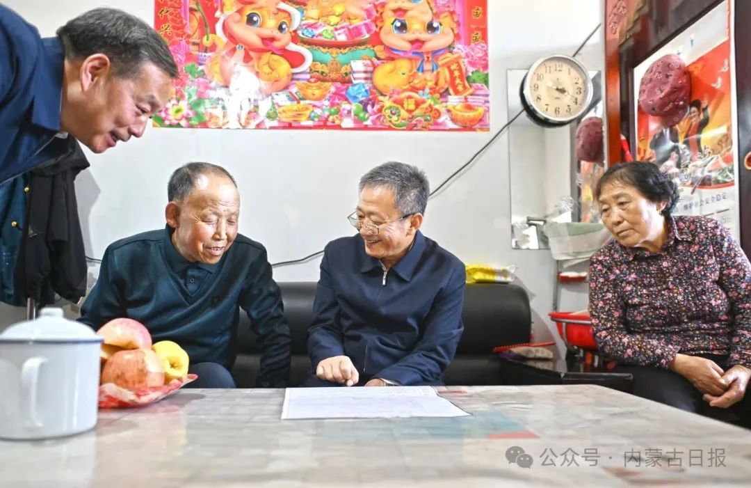 5月21日,自治區(qū)黨委書記孫紹騁在防返貧致貧監(jiān)測(cè)戶家中仔細(xì)察看惠民政策明白卡,詳細(xì)了解領(lǐng)取補(bǔ)貼情況。草原云·內(nèi)蒙古新聞網(wǎng)記者 馬建兵 攝