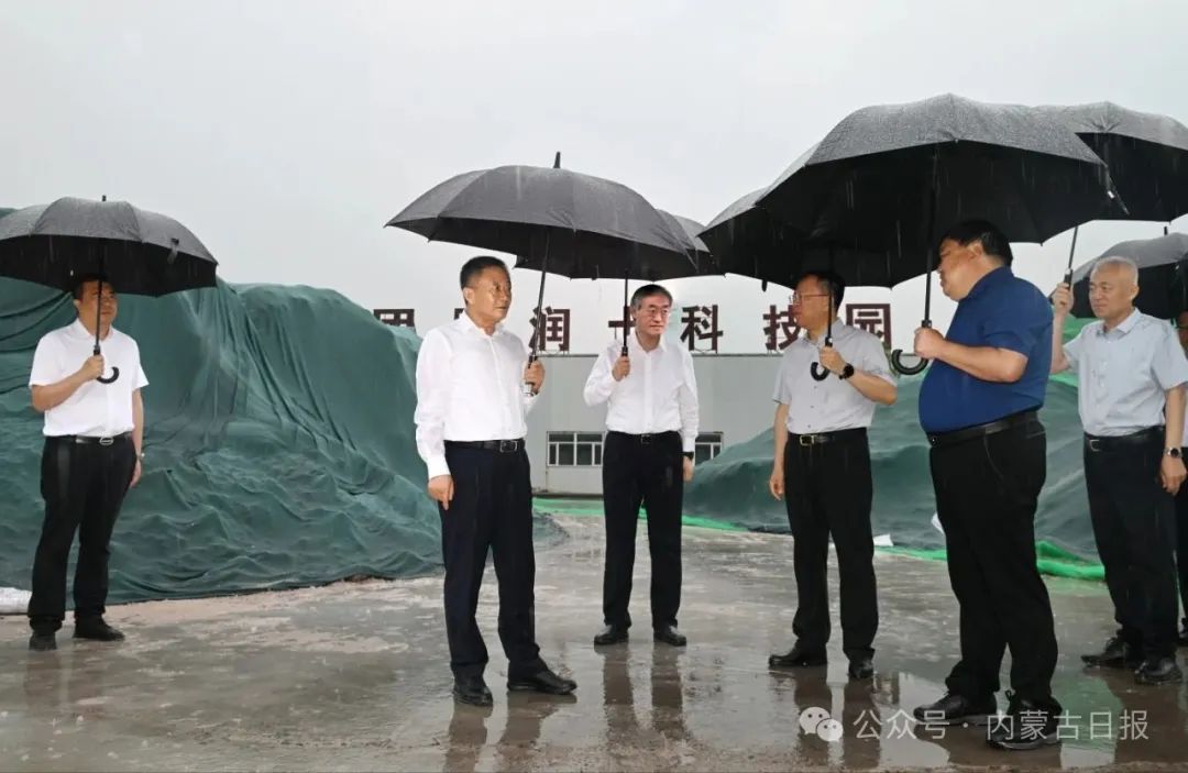 6月14日,自治區(qū)黨委書記孫紹騁來到寧城天宇膨潤土科技有限公司,實地查看企業(yè)的原料堆場,詳細(xì)詢問防塵網(wǎng)鋪設(shè)和噴淋設(shè)施配備使用情況。草原云·內(nèi)蒙古新聞網(wǎng)記者 馬建兵 攝
