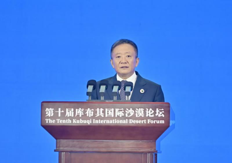 9月16日,國(guó)家林業(yè)和草原局局長(zhǎng)劉國(guó)洪在第十屆庫(kù)布其國(guó)際沙漠論壇開幕式上致辭。草原云·內(nèi)蒙古新聞網(wǎng)記者 馬建兵 攝