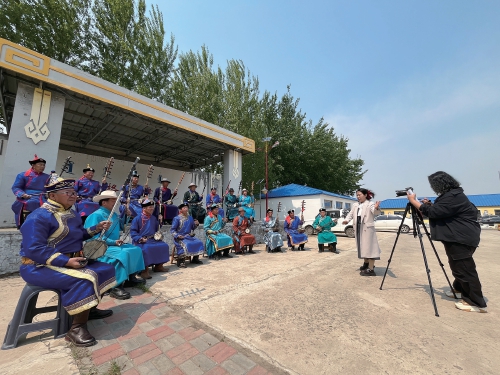 5月21日,記者走進吐列毛杜鎮(zhèn)鐵特格嘎查,恰巧遇到鎮(zhèn)黨委宣傳委員高薩日娜正在拍攝最新一期的《村聞聯(lián)播》。嘎查小舞臺上,17名村民身著蒙古族服飾,手持四胡演奏著《烏力格爾三部曲》《牧民歌唱共產黨》等悠揚的樂曲。他們大部分年齡都在五六十歲,來自當?shù)氐睦ざ祭渌暮鷧f(xié)會。該協(xié)會共有60余名會員,多年來以四胡彈奏、科爾沁民歌、烏力格爾(一種蒙古族的曲藝說書形式)、好來寶說唱等各種方式,參與著吐列毛杜鎮(zhèn)文化志愿服務。