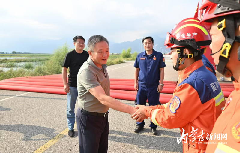 8月23日,自治區(qū)黨委書記孫紹騁在哈素海強(qiáng)排區(qū)沿著堤壩逐一看望連日堅守崗位的應(yīng)急救援人員。草原云·內(nèi)蒙古新聞網(wǎng)記者 馬建兵 攝
