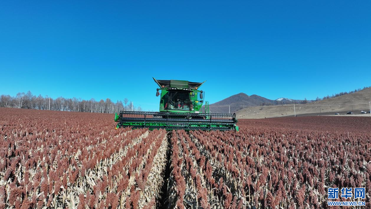 ??10月22日,在內(nèi)蒙古自治區(qū)呼倫貝爾農(nóng)墾綽爾河農(nóng)牧場(chǎng)有限公司田間,農(nóng)場(chǎng)員工正在收獲高粱。新華網(wǎng)發(fā)(哈園碩 攝)